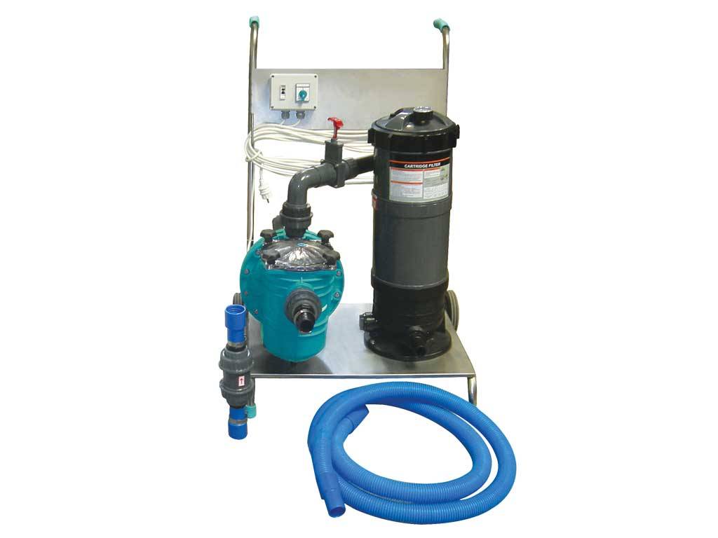 Kartuş filtresi, monofaze self-priming pompası, poolvac süpürgesi, hortumu, çekvalfi, teleskopik sapı ile komple tekerlekli AISI 304 kalite paslanmaz çelik bir araba üzerine montajlıdır. Sigorta ve 18 m kablosu ile birliktedir. Vakum a¤zı olmayan havuzlar için düşünülmüştür. Portatif filtrasyon ünitesi olarak da kullanılabilir.